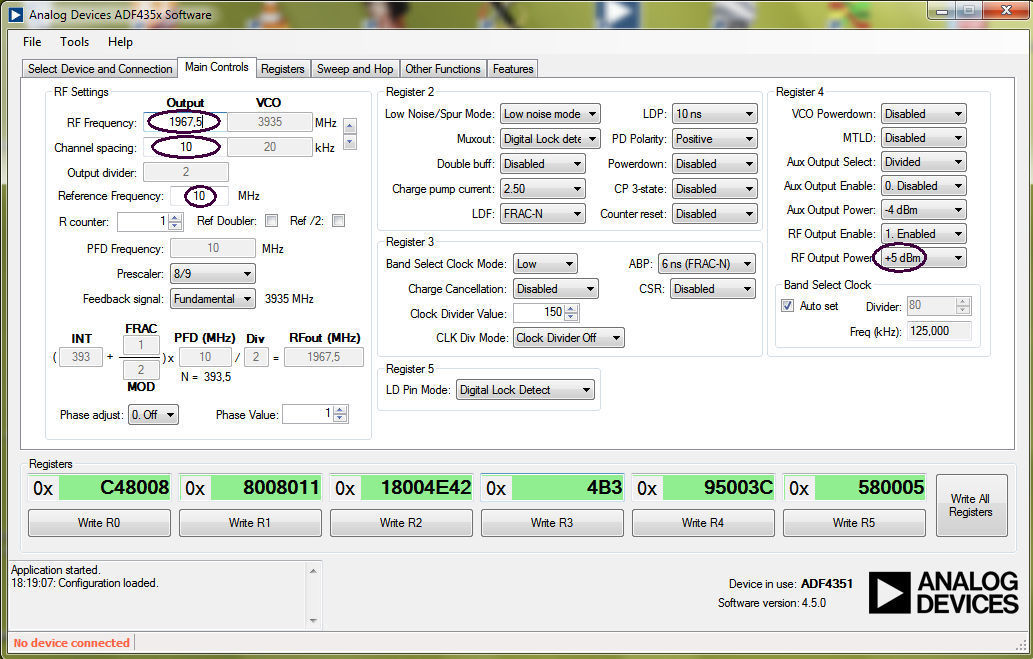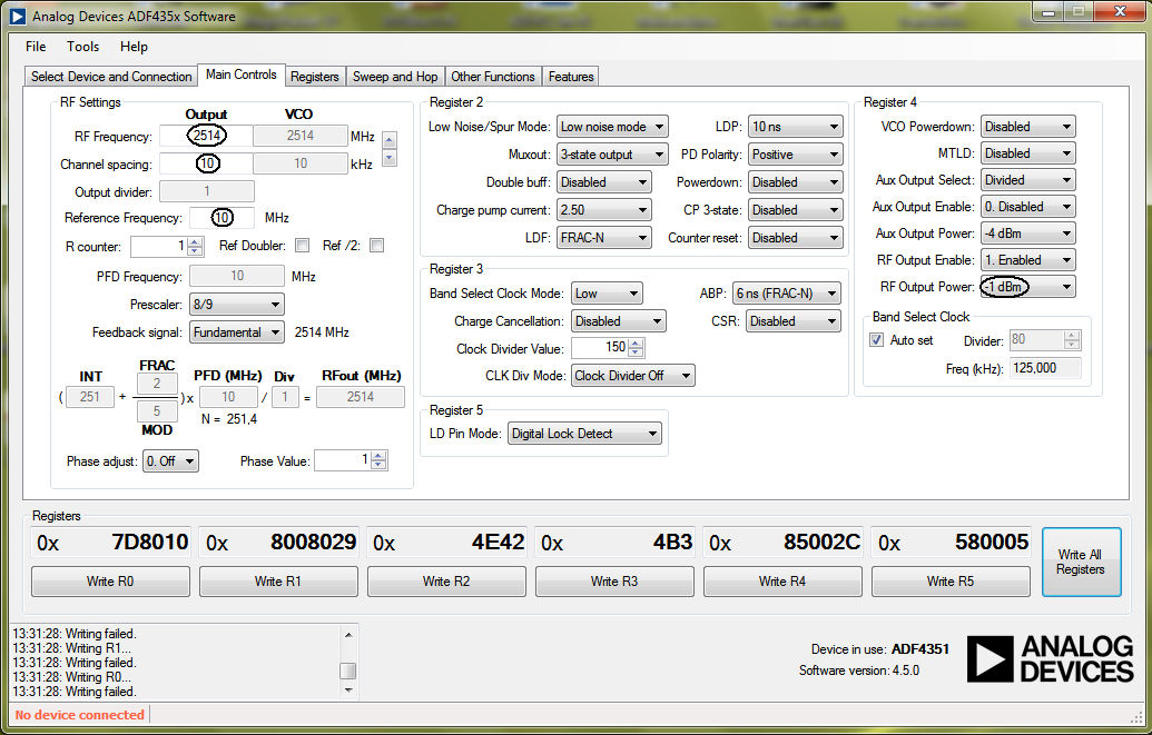 Die Berechnung der Registerwerte wird mit der freien ADF435x-Software durchgeführt die auf einem Windows-PC installiert werden kann.
